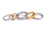 Dieses Stapelring-Set besteht aus fünf gestapelten Gliedern in drei Farben. Der Ring ist aus Edelstahl gefertigt und PVD-echt vergoldet, was für einen auffälligen und langlebigen Look sorgt.
