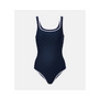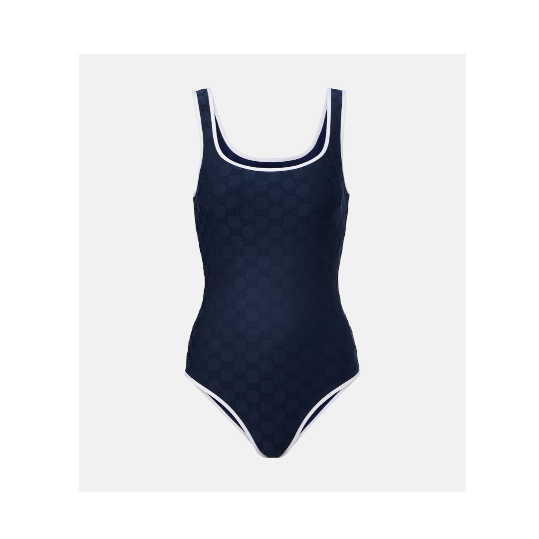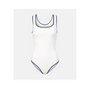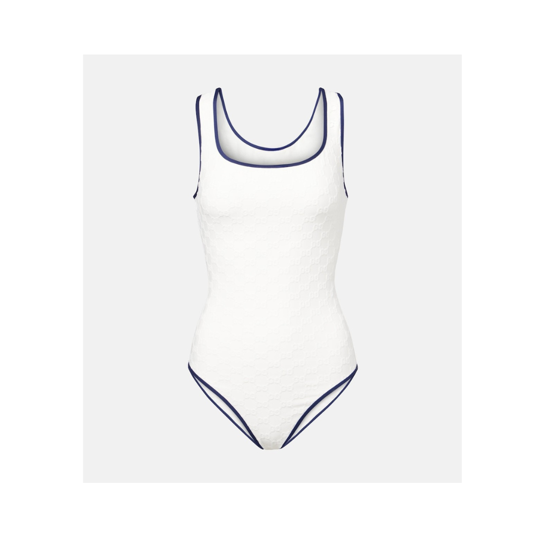 Dieser einteilige Badeanzug zeichnet sich durch ein subtiles Muster und eine figurbetonte Silhouette aus. Er verfügt über kontrastierende Zierleisten an den Rändern und einen hohen Beinausschnitt. Das Modell ist ungepolstert.
