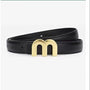 Dieser elegante Gürtel ist das perfekte Accessoire, um jedem Outfit eine stilvolle Note zu verleihen. Gefertigt aus hochwertigem echtem Leder, besticht er durch seine schmale Silhouette und eine markante, goldfarbene Schnalle in Form eines abstrahierten Buchstabens. Er kann sowohl auf der Taille als auch auf der Hüfte getragen werden und ist in zwei klassischen Farben erhältlich, die sich mühelos kombinieren lassen. Ein Must-have für eine raffinierte Garderobe.