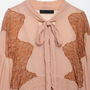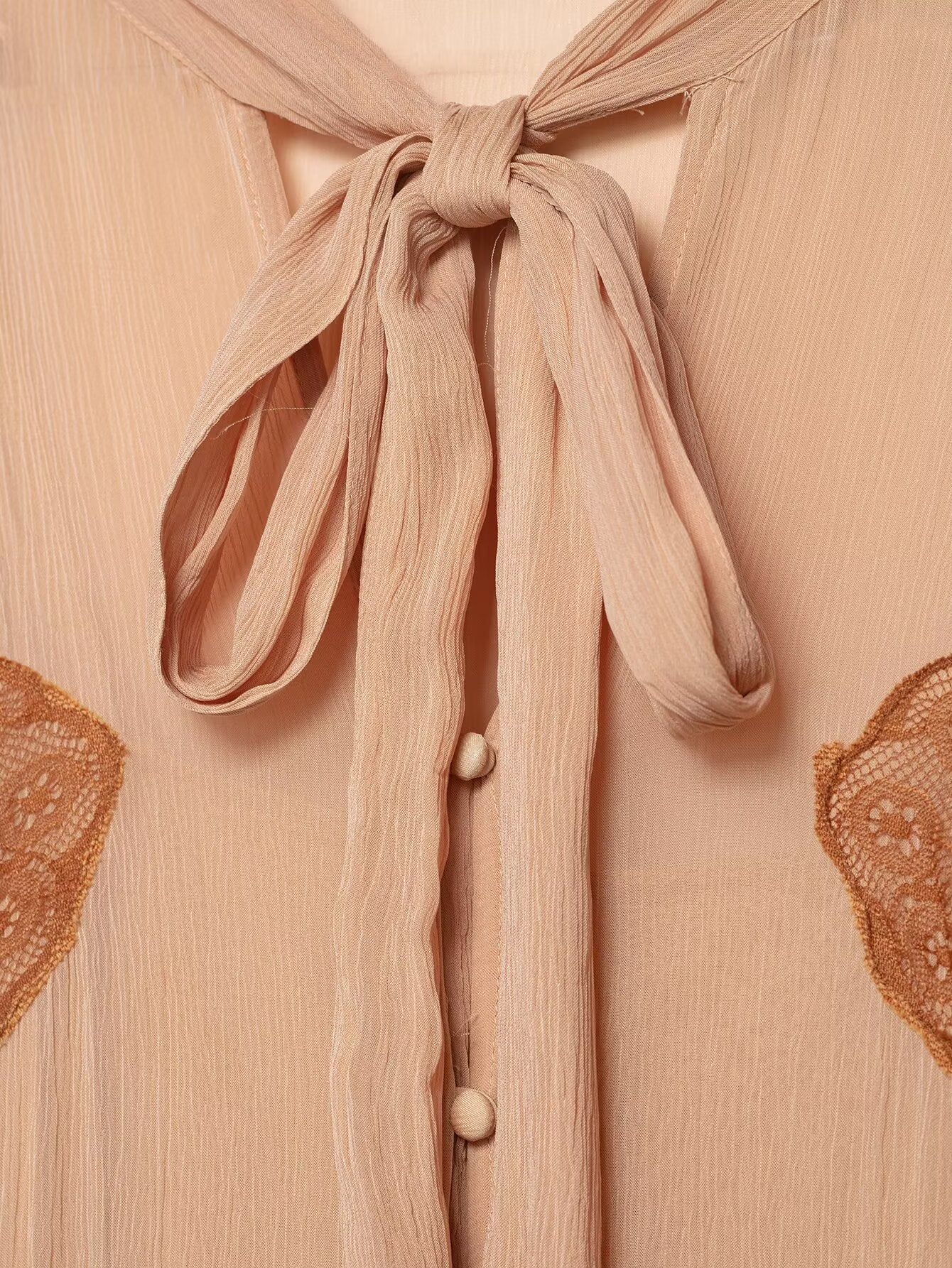 Dieses elegante und feminine Maxikleid ist in einem sanften Beigeton gehalten und mit braunen, spitzenartigen Mustern im oberen und mittleren Bereich verziert. Das Kleid ist aus einem leichten Polyestergemisch gefertigt und verfügt über einen hohen Kragen mit Schleifendetails sowie fließende, weite Ärmel und einen gestuften Rock.