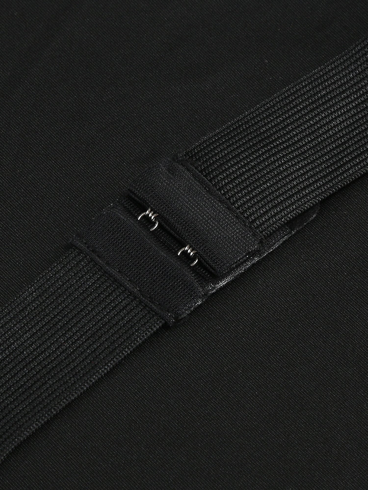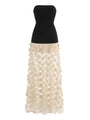 Dieses ärmellose Maxikleid hat einen trägerlosen Schnitt mit einem figurbetonten, schwarzen Oberteil. Der lange, ausladende Rock in A-Linie ist mit einem eleganten gepunkteten Mesh-Muster versehen.