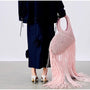Diese einzigartige Handtasche in Rosa ist ein auffälliges Accessoire mit einem verspielten, sommerlichen Look. Die Tasche besteht aus einem Polyestergemisch und zeichnet sich durch lange Fransen aus, die bei jeder Bewegung mitschwingen. Der obere Teil ist aus einem geflochtenen Material gefertigt, was einen interessanten Kontrast zum Rest der Tasche bildet.