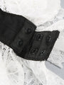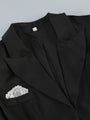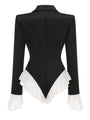 Dieser figurbetonte Bodysuit im Blazer-Stil hat einen tiefen V-Ausschnitt und lange Ärmel. Er ist mit eleganten Spitzendetails an den Ärmelabschlüssen und an der Unterseite versehen, die einen stilvollen Kontrast zum schwarzen Oberteil bilden.