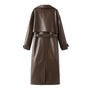 Dieser klassische Trenchcoat in einem warmen Braunton ist aus hochwertigem Kunstleder gefertigt. Der Mantel hat eine doppelte Knopfleiste, einen Gürtel mit Schnalle zur Taillenbetonung und elegante Riemen an den Ärmeln.
