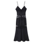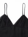 Dieses romantische und elegante Midikleid ist ein zeitloses Stück, das sich durch seine feminine Details auszeichnet. Es verfügt über zarte Spaghettiträger und einen tiefen V-Ausschnitt. Die Einsätze aus transparenter Spitze im Taillen- und Rockbereich verleihen dem Kleid eine zarte und anmutige Ästhetik.