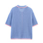 Dieses charmante und bequeme Strick-Set in Pastellfarben ist ideal für den Sommer. Es besteht aus einem kurzärmeligen Oberteil mit Kragen und passenden Shorts mit verstellbarem Kordelzug. Die zarte blaue Farbe wird durch pinkfarbene Details an den Rändern akzentuiert.