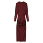 Dieses elegante Midi-Kleid hat einen tiefen V-Ausschnitt und lange Ärmel. Das Design wird durch Raffungen an der Taille betont, die eine schmeichelhafte Silhouette schaffen. Die Länge des Kleides reicht bis zur Mitte der Wade.