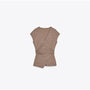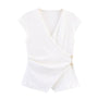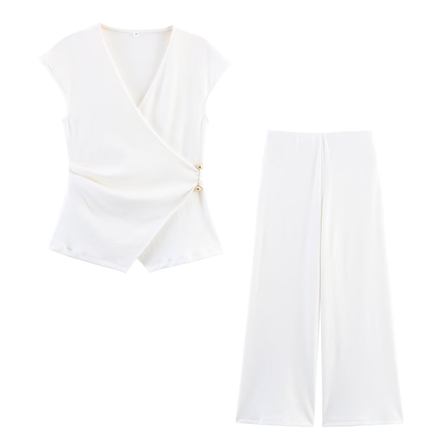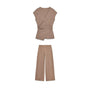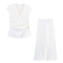 Dieses elegante Zweiteiler-Set vereint mühelos Komfort und Stil. Das Set besteht aus einem Wickel-Top mit V-Ausschnitt und einem feinen Bindedetail, das die Taille charmant in Szene setzt. Dazu passend sind die Hose mit hohem Bund und weitem Bein, die für eine fließende und entspannte Silhouette sorgt. Gefertigt aus einem weichen, strickähnlichen Material, bietet dieses Outfit sowohl Gemütlichkeit als auch einen edlen Look. Es ist vielseitig tragbar, sei es als stilvolle Loungewear oder als schickes Outfit für einen Stadtbummel.
