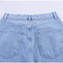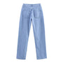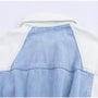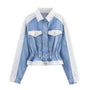 Dieses modische zweiteilige Jeans-Set kombiniert Stil und Lässigkeit. Es besteht aus einer Jeansjacke mit gekräuseltem Saum und einer passenden, weiten Jeanshose. Das Set zeichnet sich durch das zweifarbige Design in Hellblau und Weiß aus.
