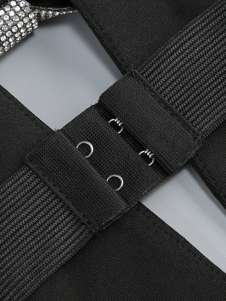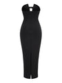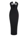 Dieses ärmellose, trägerlose Maxikleid hat einen tiefen V-Ausschnitt und einen figurbetonten, rückenfreien Schnitt. Der obere Teil ist mit einer funkelnden Strass-Schleife verziert, die dem Kleid einen glamourösen Akzent verleiht.
