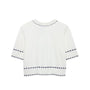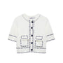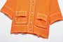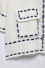 Diese Strickjacke hat einen Rundhalsausschnitt, kurze Ärmel und eine kurze Länge. Sie ist mit einer Knopfleiste auf der Vorderseite und zwei aufgesetzten Taschen mit Klappen ausgestattet. Kontrastierende Ziernähte und Kanten verleihen ihr ein Patchwork-Design.