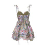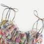 Dieses verspielte Minikleid ist eine romantische und luftige Wahl für jeden Anlass. Es besticht durch einen mehrlagigen, gerüschten Rock und schmale Träger, die einen mädchenhaften Look kreieren. Der farbenfrohe Blumendruck verleiht dem Kleid eine fröhliche und lebendige Ausstrahlung.
