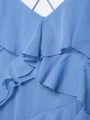 Dieses elegante und fließende Maxikleid ist die perfekte Wahl für warme Tage und besondere Anlässe. Es besticht durch dünne, sich kreuzende Spaghettiträger und eine einzigartige, kaskadenartige Rüschenverzierung, die dem Kleid eine dynamische Textur verleiht. Die luftige Silhouette des blauen Kleides sorgt für eine leichte und romantische Ästhetik.