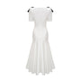 Dieses elegante Kleid in Weiß ist eine verspielte und stilvolle Wahl für besondere Anlässe. Es verfügt über einen schmeichelhaften V-Ausschnitt und kurze, geraffte Puffärmel. Das Highlight sind die großen, schwarzen Schleifen, die den Schultern einen verspielten und einzigartigen Touch verleihen.