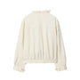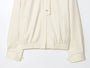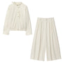 Dieses zweiteilige Set in elegantem Off-White besteht aus einer Jacke mit Stehkragen und einer passenden Hose mit weitem Bein. Die Jacke hat eine lockere Passform mit gerafftem Saum, und die Hose verfügt über einen hohen Bund mit Bundfalten, was dem Set eine schicke und bequeme Silhouette verleiht. Das Material ist ein leichtes Polyestergemisch.